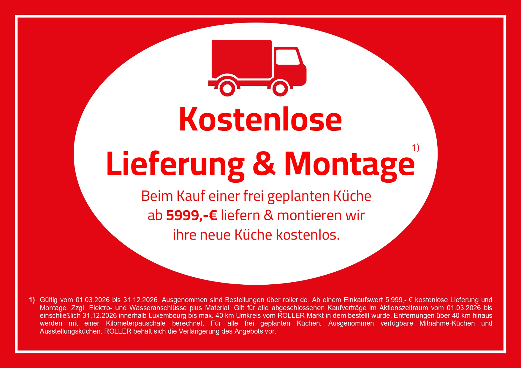 Beim Kauf einer frei geplanten Küche ab 5999,-€ liefern & montieren wir Ihre neue Küche kostenlos.